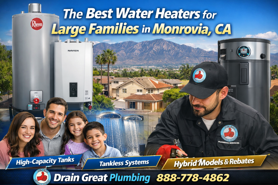 At Drain Great Plumbing, we regularly help local families upgrade undersized units to systems that actually match their household size and usage patterns. In this guide, we’ll break down the best water heater options for large families in Monrovia, what capacity really means, and how to choose a system that delivers consistent hot water year-round.