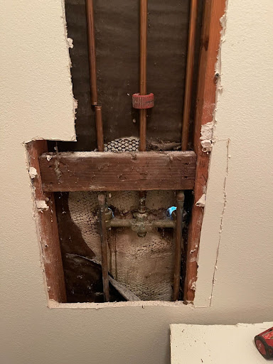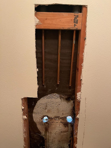 We opened the wall behind the shower to reach the valve body and piping.